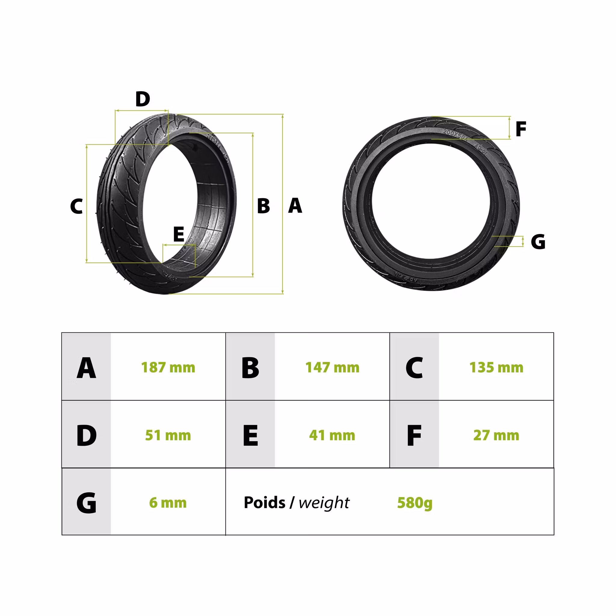 - Däck yttermått: 190mm, 120mm vid montering